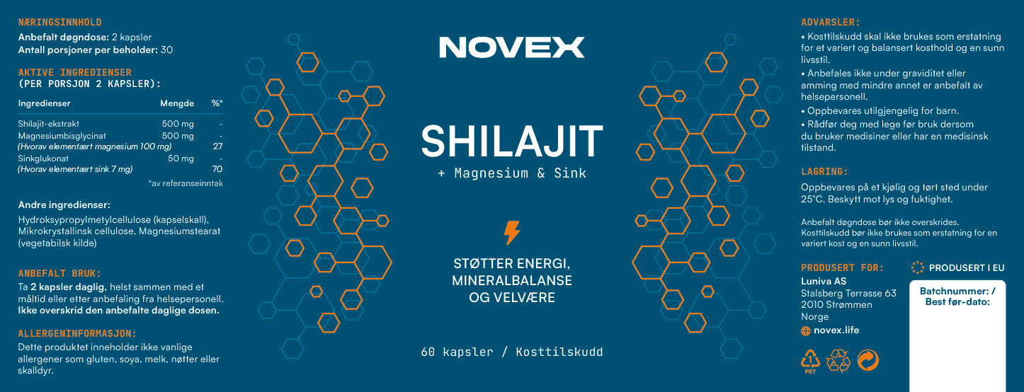 Sink og magnesium er viktige mineraler for normal hormonfunksjon, søvn og restitusjon. Shilajit er en naturlig kilde til fulvinsyre og mineraler, tradisjonelt brukt for å støtte energi, utholdenhet og generell vitalitet. Denne kombinasjonen er utviklet for menn som ønsker å optimalisere kroppens naturlige funksjoner.